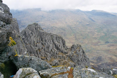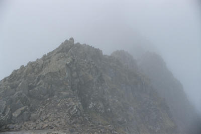 Dalszą wspinaczkę kontynuuję wspólnie z dwiema innymi osobami. Po paru minutach docieramy na szczyt Crib Goch by dalej grzbietem góry podążyć w kierunku szczytu Snowdon. Zarówno szczyt jak i grzbiet budzą respekt: po lewej przepaść, po prawej przepaść, szerokość grzbietu nie pozwala nawet się wyprostować. To robi naprawdę niezłe wrażenie! Nawet w taką pogodę. Posuwamy się więc na czworaka, okrakiem po grzbiecie góry. Może to i lepiej że chmury są tak nisko? Dzięki temu nie widać jaka przestrzeń nas otacza...