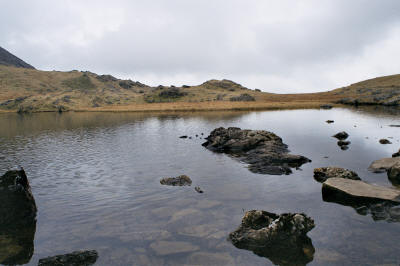 U podnóża góry czeka małe jeziorko. Można wypocząć i wymoczyć strudzone nogi. Początkowo planowałem od jeziorka zejść bezpośrednio do miejscowości docelowej (Llanaberis) ale ponieważ jest jeszcze wczesna pora postanawiam wejść na przystępny szczyt Y Garn. Tą trasę pokonuję z rękami w kieszeniach. Na szczycie znów mam problem ze znalezieniem dalszej drogi. Ani śladu ścieżki która powinna prowadzić doliną do Llanaberis. W dodatku dolina jest pogrodzona, a przejścia przez ogrodzenia występują sporadycznie. Idę więc na azymut piękną łąką podziwiając widoki, błękitnie niebo na które czekałem dwa dni i z niecierpliwością wyczekując widoku na szczyt Snowdon. Niestety mimo iż do końca dnia wypogodziło się zupełnie szczyt Snowdon jako jedyny pozostał w chmurach. Za to mogłem się z dala przyjrzeć trasie z pierwszego dnia (wtedy mało co było widać) . Trzeba przyznać że robi imponujące wrażenie, zwłaszcza wspaniałe wejście na Crib Goch.
