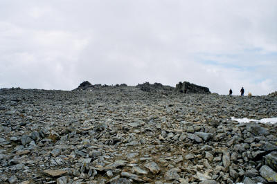 Większość śmiałków atakuje szczyt od najtrudniejszej strony przeciskając się skalnymi kominami i rozpadlinami. Ja dochodzę do wniosku że mam zbyt dużo do stracenia i zgodnie ze wskazówkami zawartymi w przewodniku trzymam się wschodniej strony zbocza. Jest w miarę wygodnie, są nawet odcinki ze ścieżkami. Do czasu. Do czasu kiedy staję przed prawie pionową ścianą: z jednej strony porośniętą mokrą trawą, z innej pokrytą obślizgłymi kamieniami. Postanawiam odpocząć. W międzyczasie mija mnie samotny turysta. On także długo szuka przejścia dalej. Gdy spuszczam go na chwilę z oka popijając herbatkę, chwilę później widzę go już znacznie wyżej. Cholera! Którędy przeszedł? Zaczynam jeszcze raz wnikliwie badać ścianę. Z półki na jej północnym krańcu dostrzegam wygodne przejście po stronie południowej. Ale żeby się tam dostać trzeba przetrawersować niecały 1 metr na półce o szerokości 15cm mając z góry pionową ścianę której nie ma się jak chwycić a z dołu kilka metrów wolnej przestrzeni. Udało się. Wkrótce mogę wypocząć na szczycie.