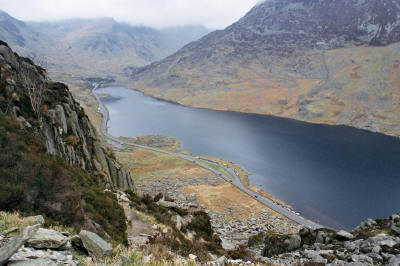 Na początek śniadanie. Dla odmiany: musli z mlekiem, następnie jajko sadzone na bekonie + kiełbaski na gorąco + tosty. Do tego dzban herbaty i świeża bułka. Po śniadaniu autostopem wyruszam nad jezioro Llyn Ogwen. Po drodze mogę podziwiać szczyt Tryfan i jego północną ścianę - już z odległości budzi duży respekt.