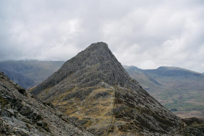 Na parkingu w Pen-y-Pass mnóstwo ludzi: młodych i starych, rodziny, dzieci. Falami wylewają się z parkingu na ścieżkę prowadzącą na szczyt. Ruszam i ja. Po kilku minutach marszu dochodzę do pierwszej przełęczy gdzie ścieżka rozdziela się na dwa szlaki: spacerowy - prowadzący doliną i trudniejszy przez grzbiet Crib Goch. Większość (w tym rodziny z dziećmi) kierują się na ten drugi. Po przejściu kilkuset metrów wygodna ścieżka kurczy się, za to biegnie coraz stromiej by w końcu wśród skał całkiem zniknąć. Zaczyna się wspinaczka. Jest mgła, mało co widać (w każdym razie nie widać gdzie jest szczyt na który mam wejść). Większość towarzystwa przystawia przy pierwszej stromszej ścianie.