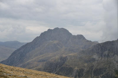 Południowe zejście jest znacznie prostsze. Po niespełna godzinie stoję pod szczytem Glyder Fach. Większość turystów pcha się prosto na skalisty grzbiet. W przewodniku ani na mapie takiego wejścia nie ma. Zgodnie ze zdrowym rozsądkiem i przewodnikiem wchodzę po żlebie po wschodniej stronie grzbietu. Kiedy docieram na górę chmury do tej pory powstrzymywane przebijają się przez szczyty i zasłaniają dokładnie wszystko.